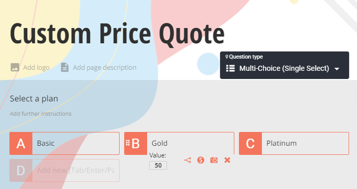 The next step is to assign values to answer options, these will be used to calculate final results. In our example, these values will be the individual costs that contribute to the price quote.